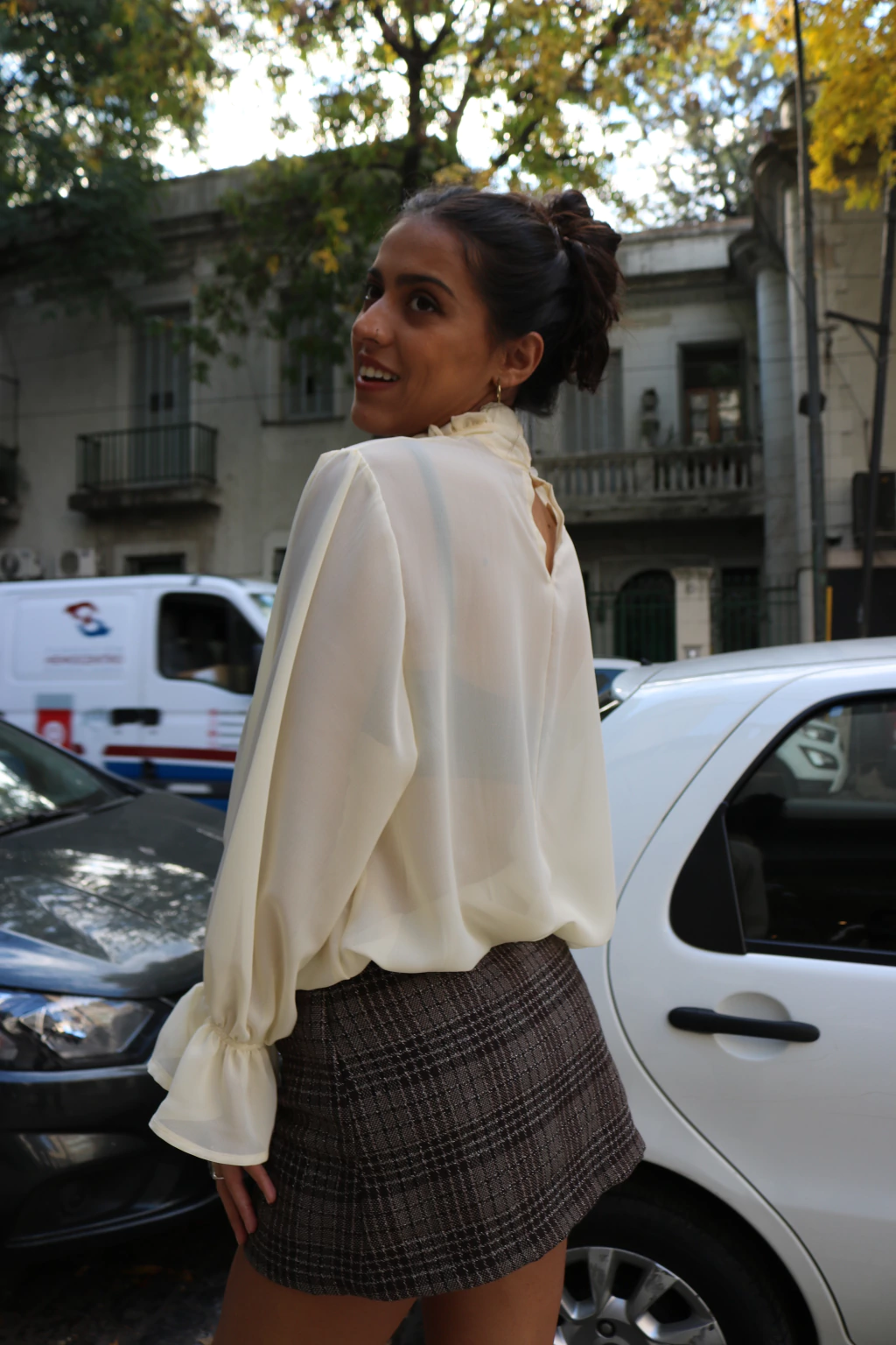 Mini falda tiro medio/bajo de tejido channel. Tiene cierre invisible en el lateral y tajo frontal. En la parte trasera tiene pinzas de entalle para un mejor calce, el tejido es rigido pero cede (no es elastizado). Viene en color bordo y en cuadrille chocolate.